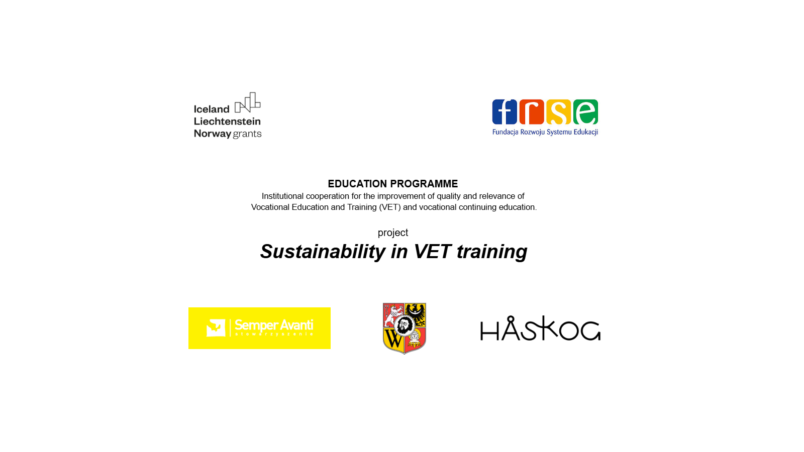 The project "Sustainability in VET training" aims to modernize the curricula of 5 selected vocational fields at schools from the Wroclaw region in Poland, with content related to sustainable development. For this reason, a project was developed involving various partners representing a stakeholder from the non-governmental sector, another from Polish public education and a local entrepreneur from Norway.